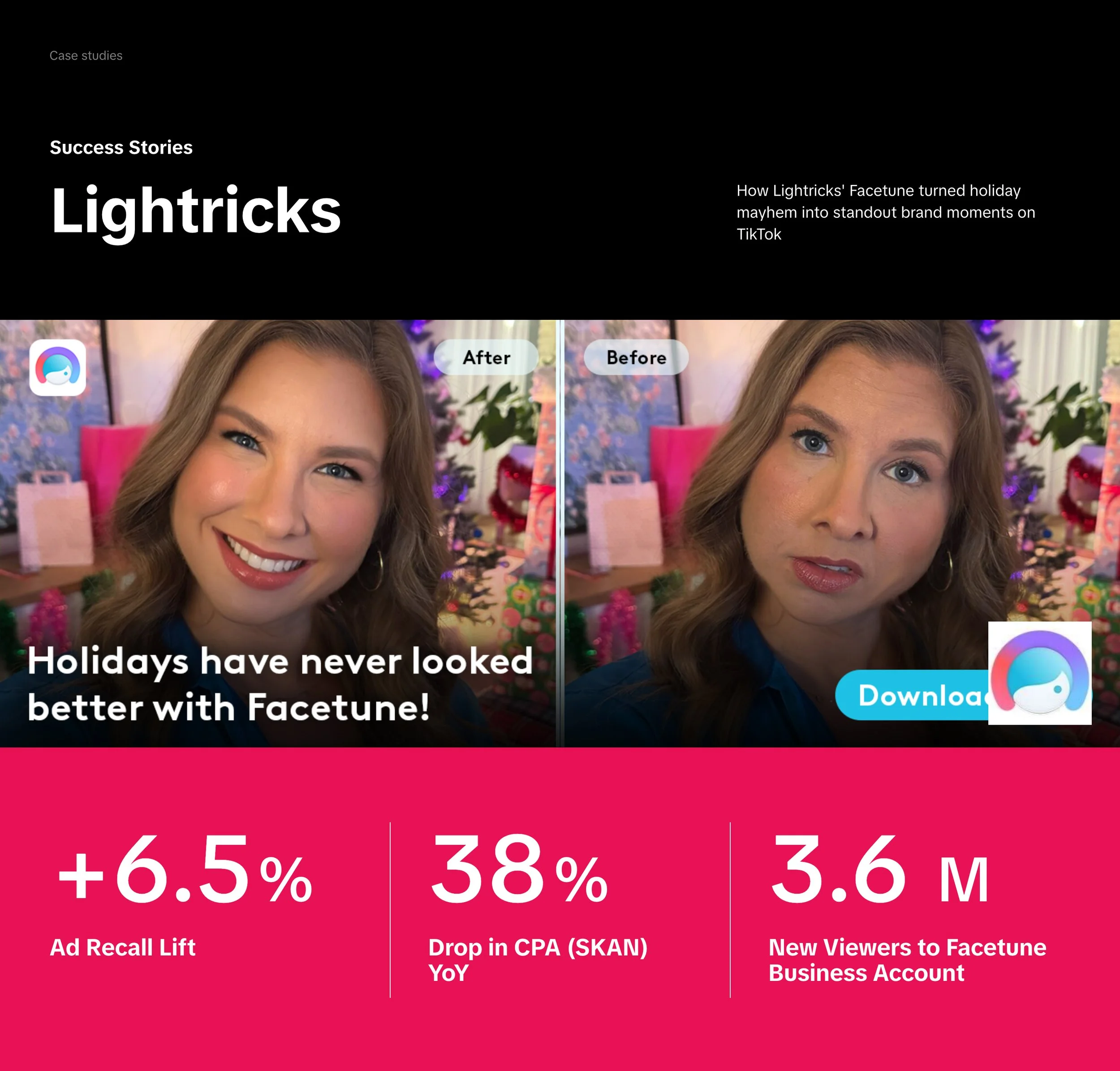 For the 2025 Facetune campaign, we took over CTV screens with bold, playful messaging: “the year of no bad photos.” I was involved end-to-end—from concept and storyboard to production, motion, and design—bringing the campaign to life across streaming and broadcast platforms. The creative highlighted Facetune’s LOOKS and Hair tools, turning every shot into your best one, while keeping the visuals fun, dynamic, and scroll-stopping. Millions of viewers caught the campaign while streaming their favorite shows, making it impossible to ignore.
